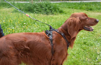 Place your dog in the harness, inserting its front legs.