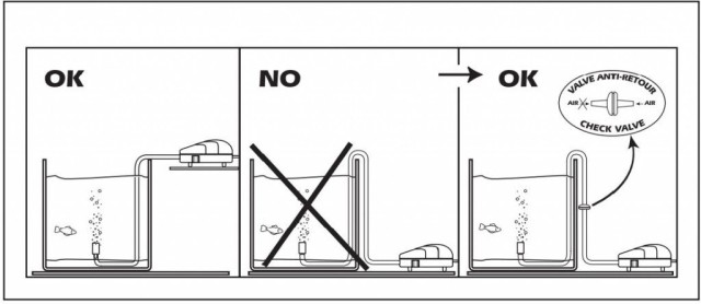 Installation is very simple and the additional aeration accessories offered by Zolux (tubing, all shapes and sizes of diffusers, valves, separators, manifolds, check valves, etc.) can be used to design and create virtually any imaginable combination (see diagram below).